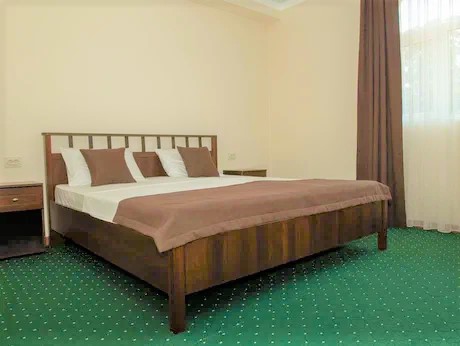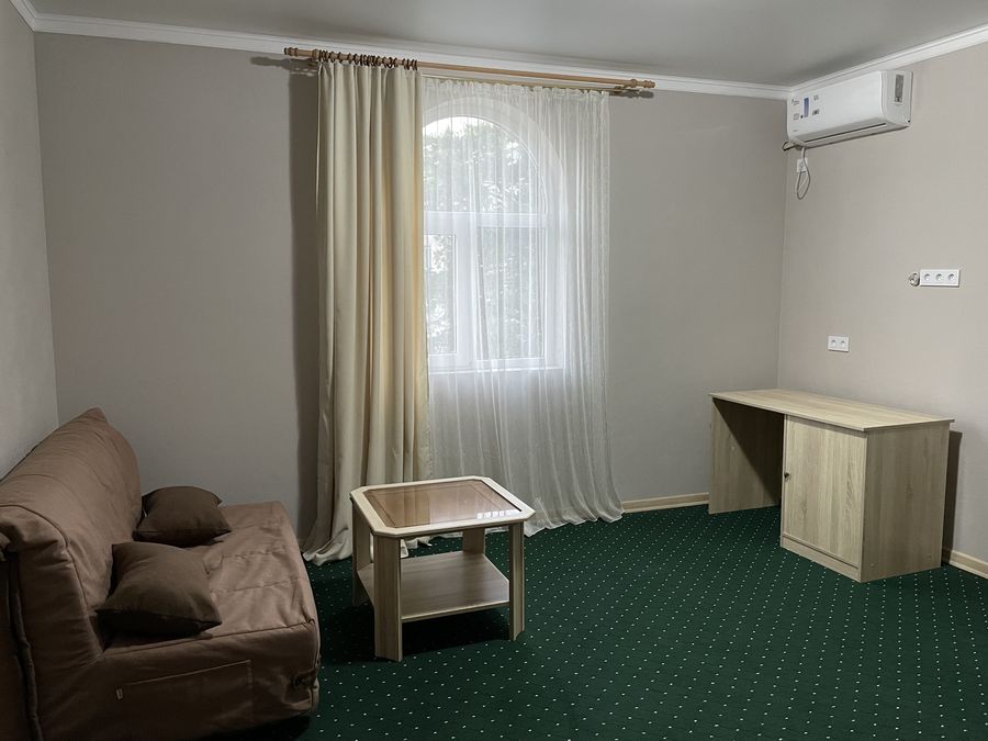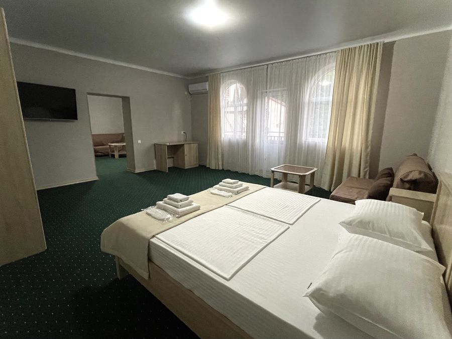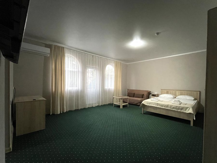 Площадь номера - 45 кв.м. 4 осн. места. 2 доп. места. Мебель: вешалка, диван раскладной, зеркало, кровать двуспальная, кровать односпальная (или двуспальная), прикроватные тумбочки, стол, стул, шкаф. Оборудование: сплит-система, телевизор, холодильник. Санузел: с душем, туалетные принадлежности, фен. Сервис: Wi-Fi бесплатно, смена полотенец, смена постельного белья, уборка номера.