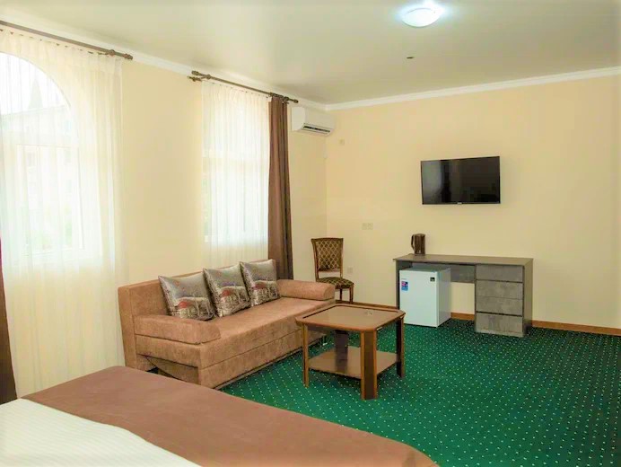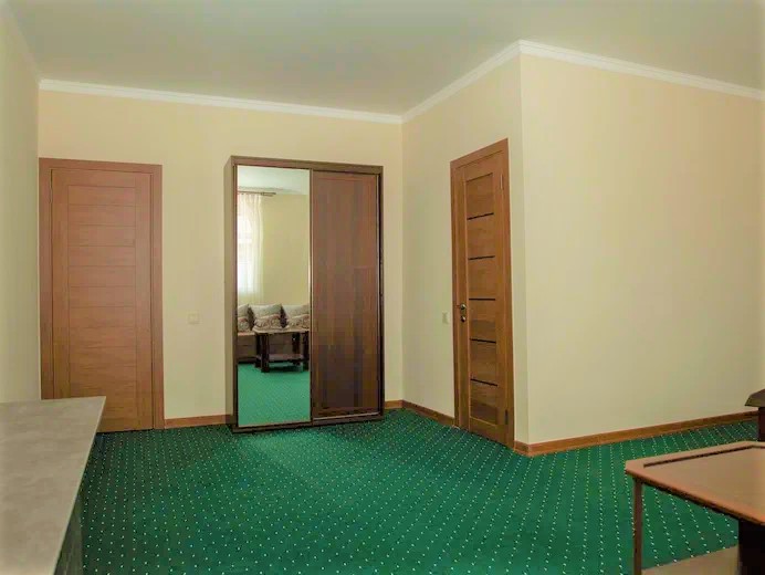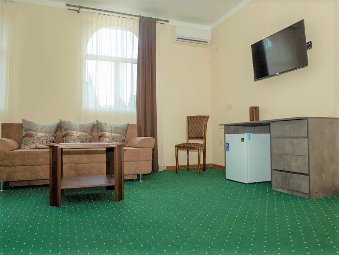 Площадь номера - 45 кв.м. 4 осн. места. 2 доп. места. Мебель: вешалка, диван раскладной, зеркало, кровать двуспальная, кровать односпальная (или двуспальная), прикроватные тумбочки, стол, стул, шкаф. Оборудование: сплит-система, телевизор, холодильник. Санузел: с душем, туалетные принадлежности, фен. Сервис: Wi-Fi бесплатно, смена полотенец, смена постельного белья, уборка номера. Терраса.