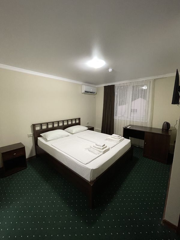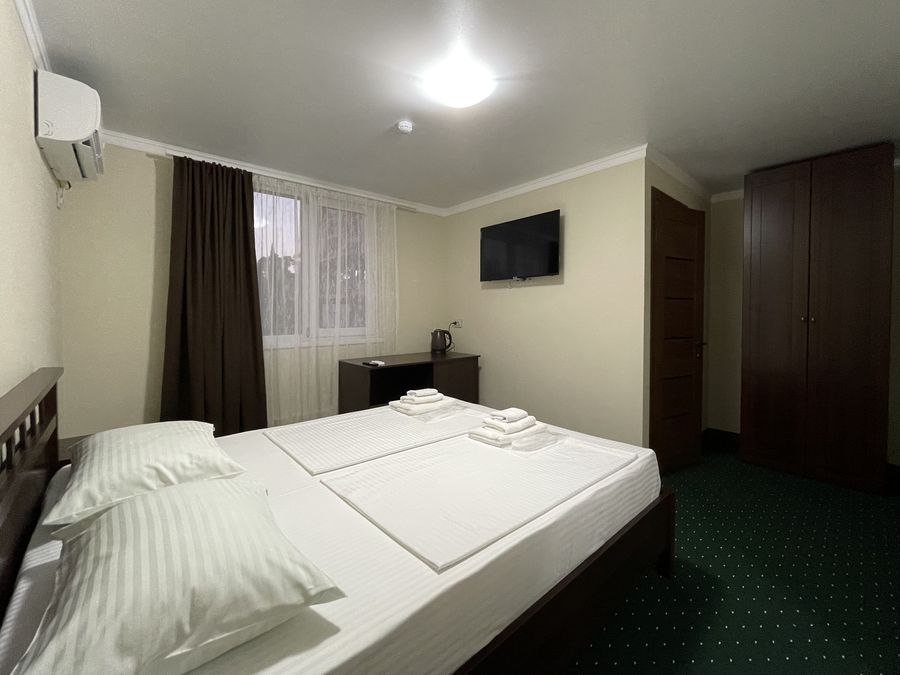 Площадь номера - 17 кв.м. 2 осн. места. Мебель: вешалка, зеркало, кровати односпальные /одна двуспальная кровать, прикроватные тумбочки, стол, стул, шкаф. Оборудование: сплит-система, телевизор, холодильник. Санузел: с душем, туалетные принадлежности, фен. Сервис: Wi-Fi бесплатно, смена полотенец, смена постельного белья, уборка номера.