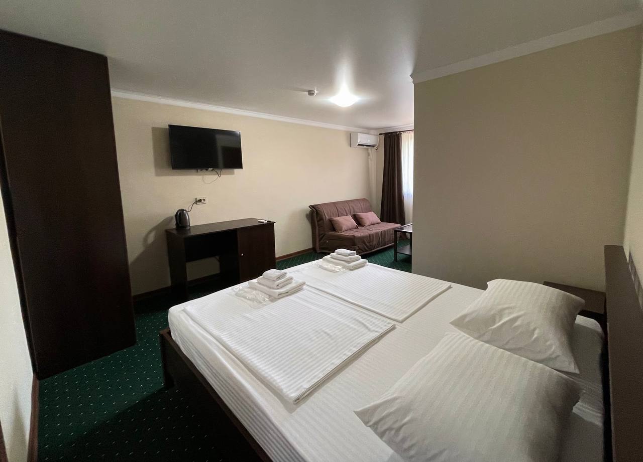 Площадь номера - 23 кв.м. 2 осн. места. 1 доп. место. Мебель: вешалка, зеркало, кровать двуспальная, прикроватные тумбочки, стол, стул, шкаф. Оборудование: сплит-система, телевизор, холодильник. Санузел: с душем, туалетные принадлежности, фен. Сервис: Wi-Fi бесплатно, смена полотенец, смена постельного белья, уборка номера.